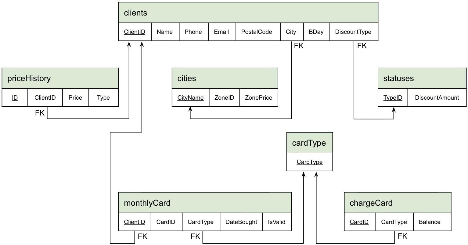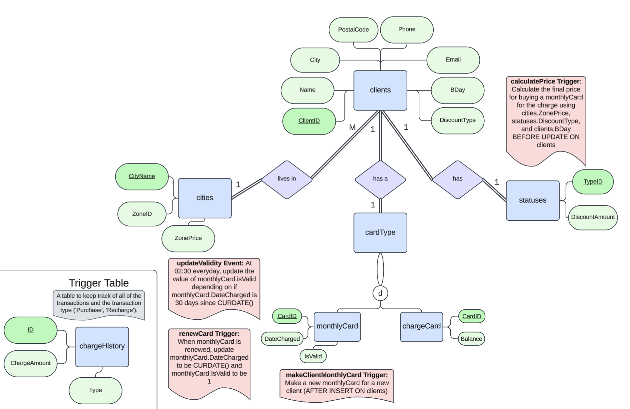 The objective of the project was to design and implement a MySQL database that could, in theory, serve as the backbone of Madrid’s metro system—automatically handling ticket dispensing and decommissioning (upon expiration), calculating fare prices based on the client’s city zone and discount eligibility, and incorporating a detailed schema and features derived from a set of assumptions.